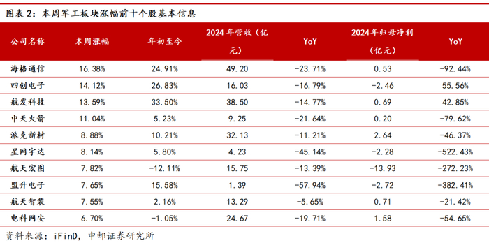 本周军工涨幅前十的个股为:海格通信(+16.38%)、四创电子(+14.12%)、航发科技(+13.59%)、中天火箭(+11.04%)、派克新材(+8.88%)、星网宇达(+8.14%)、航天宏图(+7.82%)、盟升电子(+7.65%)、航天智装(+7.55%)、电科网安(+6.70%)。