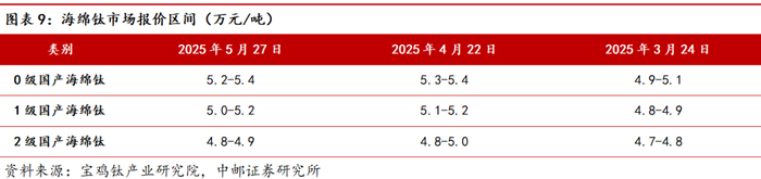 海绵钛价格跟踪:宝鸡钛产业研究院5月27日给出海绵钛市场报价区间:0级国产海绵钛价格5.2-5.4万元/吨;1级国产海绵钛价格5.0-5.2万元/吨;2级国产海绵钛价格4.8-4.9万元/吨。