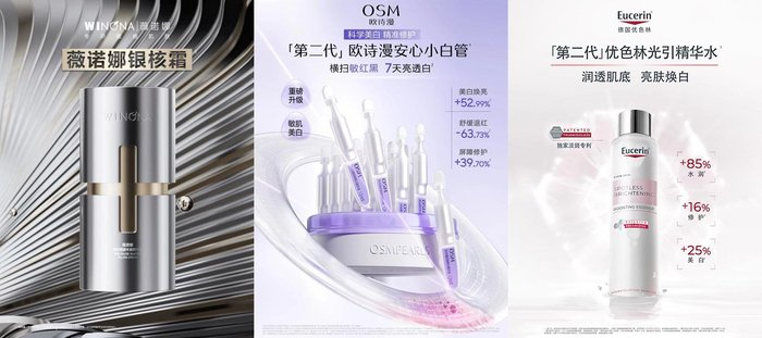 例如,薇诺娜在五月推出的「薇诺娜银核霜」,定位于敏感肌抗老;欧诗漫则从打破“敏暗循环”的链路出发,通过修、控、白的全新体系带来进化版「欧诗漫安心小白管2.0」;以持证美白祛斑成分Thiamidol 630为核心成分的「优色林光引精华」也在今年升级到第二代,产品定位直指“敏肌美白”战场。