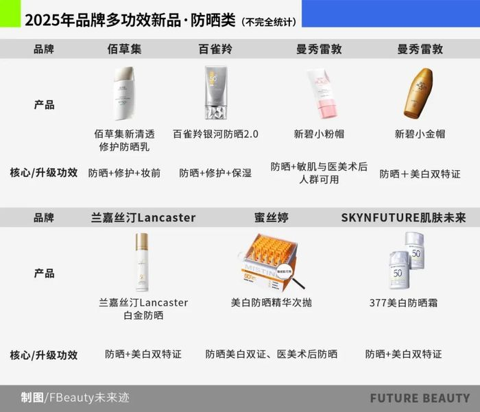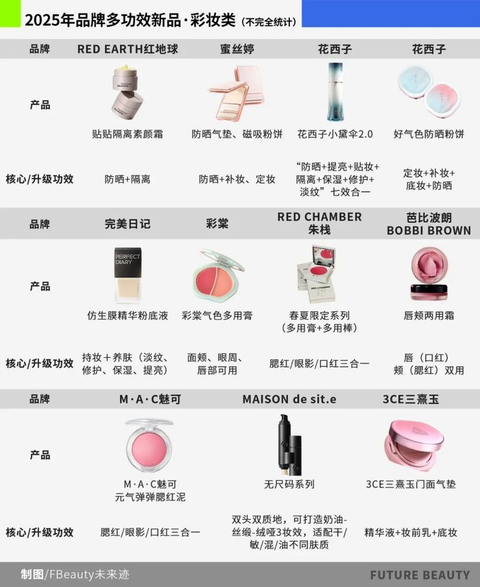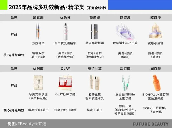《FBeauty未来迹》发现,2025年以来,品牌们在升级经典单品或推出新品时,都不约而同地将“多功能合一”作为核心卖点。这一现象在护肤精华、防晒以及彩妆品类中尤其突出。