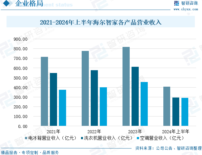 海尔智家股份有限公司自成立以来,始终致力于成为时代的企业,通过不断推出引领市场的创新产品,持续创新迭代,把握行业机遇。经过30多年发展,公司已经成为全球大家电行业的领导者和全球智慧家庭解决方案的引领者。公司主营业务覆盖家电的研发、生产以及销售工作,主要产品包括冰箱、冷柜、洗衣机、空调、热水器等家电设备。海尔智家积极布局智能家电领域,推动家电智能化升级,为用户提供一站式智慧解决方案,打造智能家居新体验。数据显示,2024年上半年,海尔智家电冰箱营业收入同比增长1.38%至408.59亿元;洗衣机营业收入同比增长4.63%至294.27亿元;空调营业收入同比增长3.65%至290.11亿元。