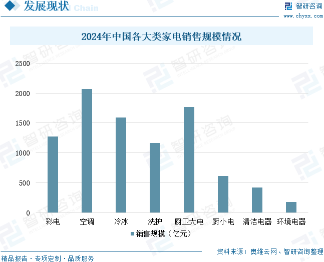 分品类来看,我国家电市场分品类主要分为清洁、彩电、洗护、冰冷、厨卫大电、环境电器、厨小电、空调。2024我国彩电销售规模为1271亿元,同比增长15.7%;空调销售规模为2071亿元,同比下降2.1%;冰冷家电器销售规模为1587亿元,同比增长9.7%;洗护类家电销售规模为1166亿元,同比增长9.8%;厨卫大电销售规模为1764亿元,同比增长5.7%;厨小电销售规模为609亿元,同比下降0.8%;清洁电器销售规模为423亿元,同比增长24.4%,环境电器销售规模为180亿元,同比增长2.7%。