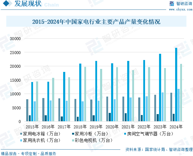 家电行业是我国国民经济传统优势产业,近年来,随着居民收入水平提高,消费者对家电产品的需求从基本功能向智能化、高端化、个性化转变。例如,智能冰箱、智能空调、智能洗衣机等产品的需求快速增长,推动了家电制造商加大研发投入和生产力度。与此同时,我国持续深入实施增品种、提品质、创品牌“三品”行动,推动绿色智能健康家电新产品加速引领消费升级,各地家电产品以旧换新活动有效开展,促使家电产品产量保持较快增长。国家统计局数据显示,2024年中国家用电冰箱产量为10395.7万台,同比增长7.93%;家用冷柜产量为2761.5万台,同比增长6.35%;房间空气调节器产量为26598.4万台,同比增长8.62%;家用洗衣机产量为11736.5万台,同比增长12.22%;彩色电视机产量为20745.4万台,同比增长7.27%。