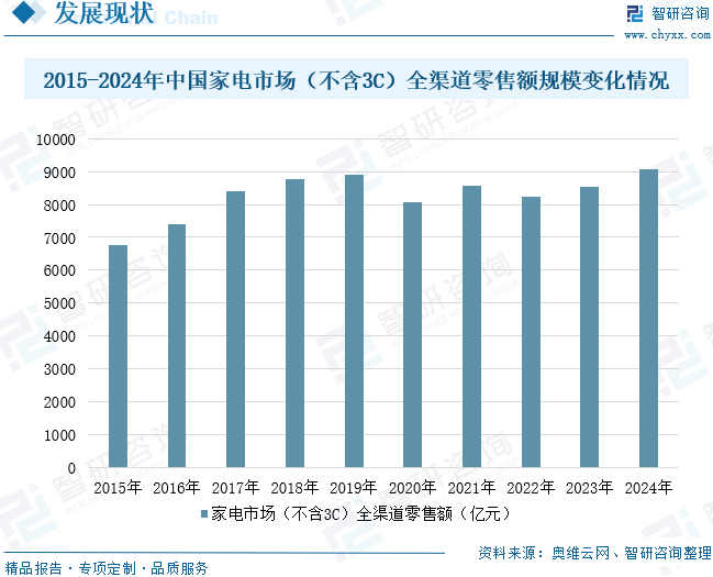 从家电市场(不含3C)全渠道零售额来看,随着人们生活水平的稳步提升,消费观念也在发生深刻变革。家电产品从原来仅满足基本生活需求的工具到如今成为提升生活品质的关键元素。消费者不再仅仅满足家电的基本功能,对智能化、高品质家电的需求日益旺盛。智能冰箱、扫地机器人等智能化产品不仅提升了居民的生活便利性,还满足了消费者对科技感和舒适生活的追求,成为推动家电市场持续增长的核心动力。近年来,在一系列扩内需、促消费政策的推动下,国内消费需求持续释放,市场活力不断增强。数据显示,近十年,我国家电市场(不含3C)全渠道零售额整体呈波动式增长趋势。2024年,我国家电市场(不含3C)全渠道零售额为9071亿元,同比增长6.4%,创历史新高。