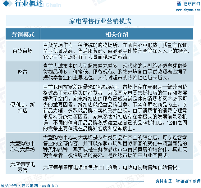 家电零售是指通过买卖形式将家电产品直接售给居民作为生活消费用或售给社会集团供公共消费用的商品销售模式。家电零售行业营销模式主要包括百货商场、超市、便利店、折扣店、大型购物中心与大卖场以及无店铺家电零售。