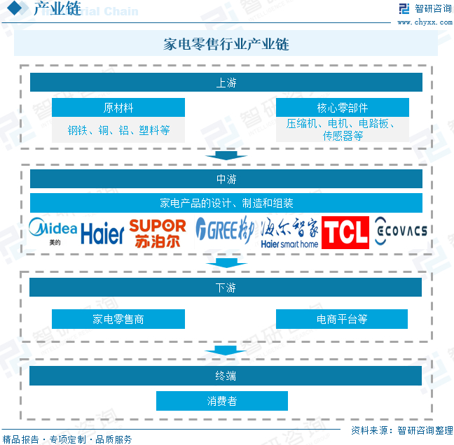 家电零售行业产业链上游为原材料供应与核心零部件制造,原材料包括钢铁、铜、铝、塑料等基础材料,这些材料是家电产品制造的基础。核心零部件则包括压缩机、电机、电路板、传感器等,这些零部件的技术水平和质量直接影响到家电产品的性能和可靠性。中游环节是家电产业链的核心,主要包括家电产品的设计、制造和组装。下游环节主要包括家电产品的销售和售后服务。下游企业通常是家电零售商和电商平台,如苏宁、国美、京东、天猫等。这些企业负责将中游制造商生产的产品通过线上线下渠道销售给最终消费者。随着消费者购物习惯的变化,下游零售商正在加速线上线下融合,提供全渠道购物体验。