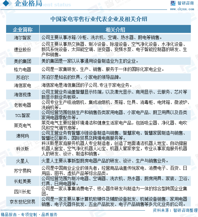 中国家电零售行业企业竞争较为激烈,市场份额持续向头部品牌集中。目前家电全行业形成三大巨头+两小巨头格局。美的、格力、海尔三大巨头利润遥遥领先,占全行业利润过半份额;TCL、海信集团作为两小巨头紧紧跟上。在消费升级驱动下,品质消费理念深入人心,消费者越来越倾向于选购知名度高、服务口碑好的品牌,小品牌还将继续被边缘化,甚至被淘汰。目前,中国家电零售上市企业包括海尔智家、德业股份、美的集团、格力电器、苏泊尔、海信家电、海信视像、老板电器、TCL智家、莱克电气、澳柯玛、科沃斯、火星人、苏宁易购、长虹美菱、四川长虹、京东世纪贸易等。