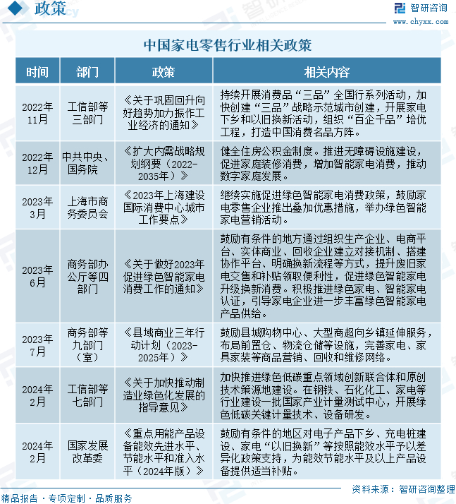 中国家电零售行业的政策环境对行业的发展具有重要影响。近年来,政府出台了一系列政策,旨在推动家电零售行业的转型升级、促进消费升级和绿色发展。例如,2024年2月,工信部等七部门印发《关于加快推动制造业绿色化发展的指导意见》,提出要加快推进绿色低碳重点领域创新联合体和原创技术策源地建设。在钢铁、石化化工、家电等行业建设一批国家产业计量测试中心,开展绿色低碳关键计量技术、设备研发。2024年2月,国家发展改革委印发《重点用能产品设备能效先进水平、节能水平和准入水平(2024年版)》,提出要鼓励有条件的地区对电子产品下乡、充电桩建设、家电“以旧换新”等按照能效水平予以差异化政策支持,为能效节能水平及以上产品设备提供适当补贴。