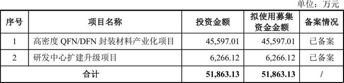本此拟募资用途:本次拟募集资金5.19亿,其中4.56亿用于高密度QFN/DFN封装材料产业化项目,0.63亿用于研发中心扩建升级项目。具体项目如下: