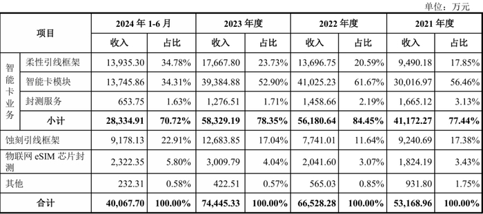 2024年公司主营收入按产品类别可分为四大板块,分别为智能卡业务(5.62亿元,69.28%)、蚀刻引线框架(1.94亿元,23.88%)、物联网eSIM芯片封测(0.48亿元,5.96%)、其他产品(0.07亿元,0.88%)。2022年至2024年间,智能卡业务一直为公司的核心业务及首要收入来源,收入占比稳定在 60%以上;但与此同时,随着蚀刻引线框架、物联网eSIM芯片封测等新业务开展,两者合计收入占比不断抬升,由2022年的14.71%增至2024年的29.84%。