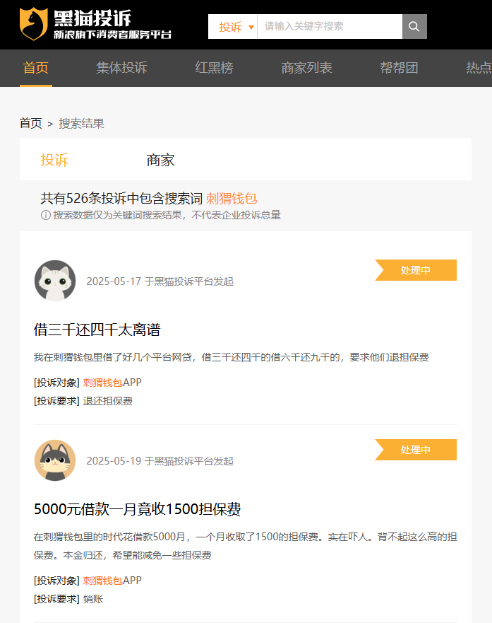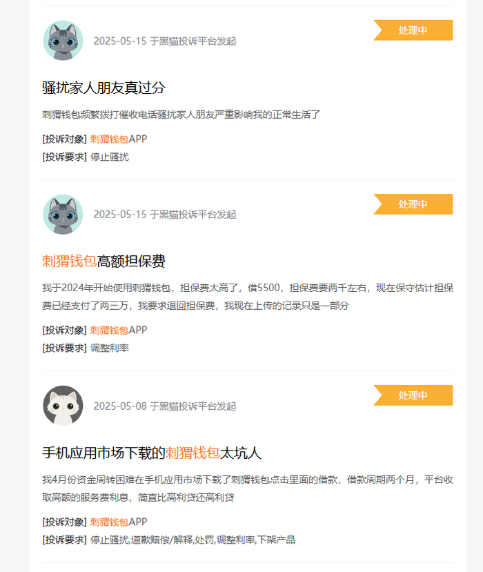 李德宝的遭遇并非个例。记者调查发现,截至6月9日,在新浪旗下消费者投诉平台“黑猫投诉”,关于刺猬钱包APP的累计投诉,达523条。其中,多为消费者对刺猬钱包APP内金融产品收取大额担保费。