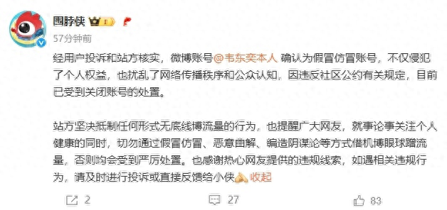 6月10日,微博官方发文:经用户投诉和站方核实,微博账号@韦东奕本人 确认为假冒仿冒账号,不仅侵犯了个人权益,也扰乱了网络传播秩序和公众认知,因违反社区公约有关规定,目前已受到关闭账号的处置。