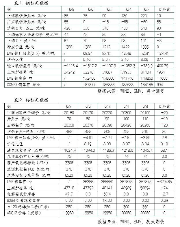 铜方面,据SMM讯,截至6月9日周一,SMM全国主流地区铜库存较上周四增0.07万吨至14.95万吨,主因上海地区累库。现货市场方面,6月9日SMM 1#电解铜现货对当月2506合约报升水20-升水150元/吨,均价报价升水85元/吨,较上一交易日上升10元/吨。下游采购情绪不佳,持货商因临近交割并无继续大量贴水报价。广东地区到货减少,库存继续下降,持货商积极挺价出货,整体交投尚可。