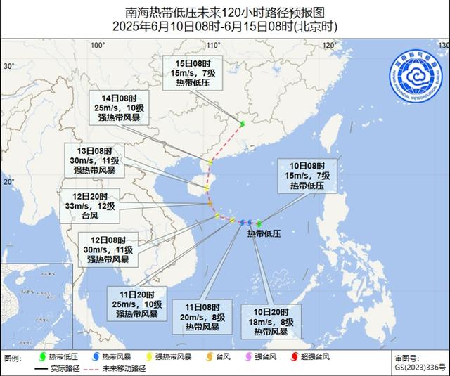 海南省气象局2025年6月10日11时30分发布台风四级预警,热带低压已在南海中部海面生成,24小时内将加强为今年第1号台风,逐渐向海南岛东部沿海靠近,并可能于13日前后在海南岛东部沿海地区登陆(强热带风暴级到台风级)。