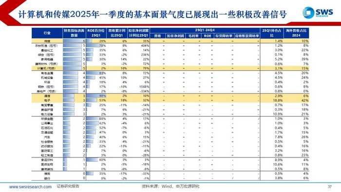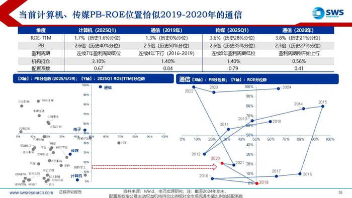 当前计算机、传媒PB-ROE位置恰似2019-2020年的通信;计算机、传媒基本面持续多年处于历史低位,且2025年一季度的基本面景气度已展现出一些积极改善信号;历史上非流动性危机熊市的环境下,TMT如果是春季躁动的旗手,调整之后那么仍可期待后续行情:下半年看好人工智能赋能金融改革创新的行情。