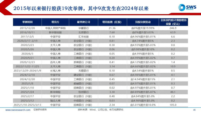 国际估值对比:当前中国金融龙头行业估值显著低于美国和日本;银行基本面承压,但分红比例和股息率持续提升,对增量资金保持吸引力,2015年以来银行股获19次举牌,其中9次发生在2024年以来。