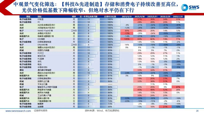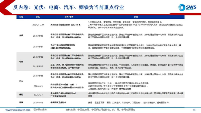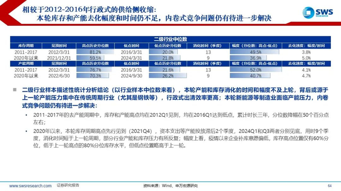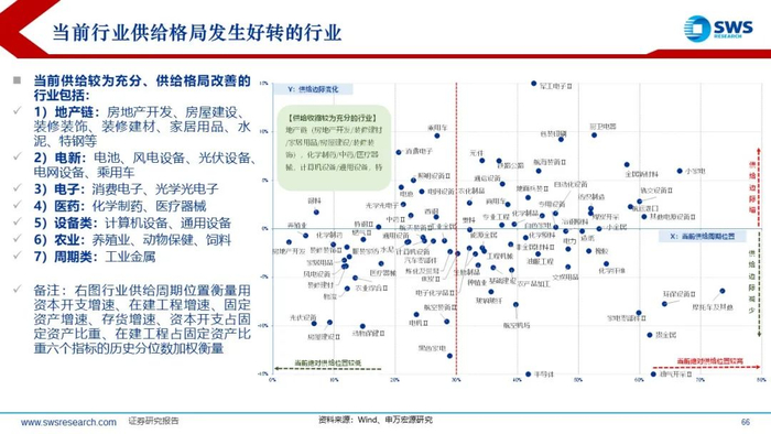 相较于2012-2016年行政式的供给侧收缩:本轮库存和产能去化幅度和时间仍不足,内卷式竞争问题仍有待进一步解决;光伏、电商、汽车、钢铁为当前反内卷的重点行业。当前供给收缩较为充分、供给格局改善的行业包括:1)地产链:房地产开发、房屋建设、装修装饰、装修建材、家居用品、水泥、特钢等;2)电新:电池、风电设备、光伏设备、电网设备、乘用车;3)电子:消费电子、光学光电子;4)医药:化学制药、医疗器械;5)设备类:计算机设备、通用设备;6)农业:养殖业、动物保健、饲料;7)周期类:工业金属。