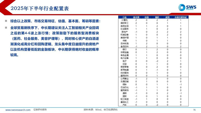 综合以上政策、市场交易特征、估值、基本面、筹码等因素:全球贸易新秩序下,中长期建议关注人工智能相关产业回调之后的第4-6波上涨行情;政策鼓励下的服务型消费板块(医药、社会服务、美容护理等),同时核心资产的白酒逐渐演化成高分红和回购逻辑、龙头集中度日益提升的房地产以及机构显著低配的金融板块,中长期获得绝对收益的概率较高。