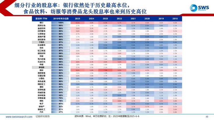 当前仅照明设备、养殖业、白酒、种植业这4个行业5月以来相比4月7日(上证3040点,关税冲击)继续创新低,而其中白酒历年6月相对上涨取得超额正收益率的概率较大。白酒逐渐演化成高分红和回购逻辑:当前股息率4%超过无风险利率。
