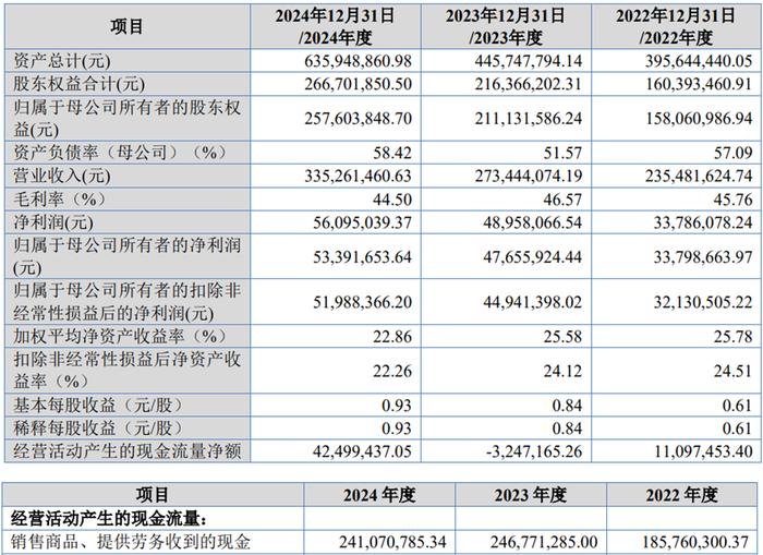 2022年至2024年,交大铁发的营业收入分别为2.35亿元、2.73亿元和3.35亿元,净利润分别为3378.61万元、4895.81万元和5609.50万元;归属于母公司所有者的净利润分别为3379.87万元、4765.59万元、5339.17万元;归属于母公司所有者的扣除非经常性损益后的净利润分别为3213.05万元、4494.14万元和5198.84万元。