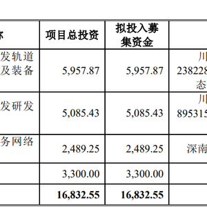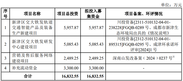 交大铁发2025年5月23日披露的招股书显示,公司拟募集资金16,832.55万元,用于新津区交大铁发轨道交通智能产品及装备生产新建项目、新津区交大铁发研发中心建设项目、营销及售后服务网络建设项目、补充流动资金。