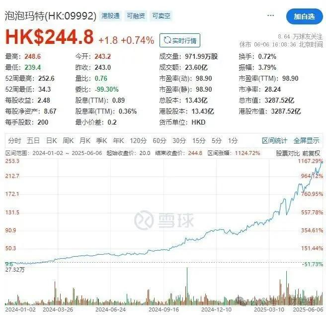 截至6月6日收盘,泡泡玛特股价报244.8港元/股,总市值3287.52亿港元。今年以来,泡泡玛特股价已上涨174%。若将时间线拉长,从2024年初至今,泡泡玛特的股价涨幅超过了11倍。