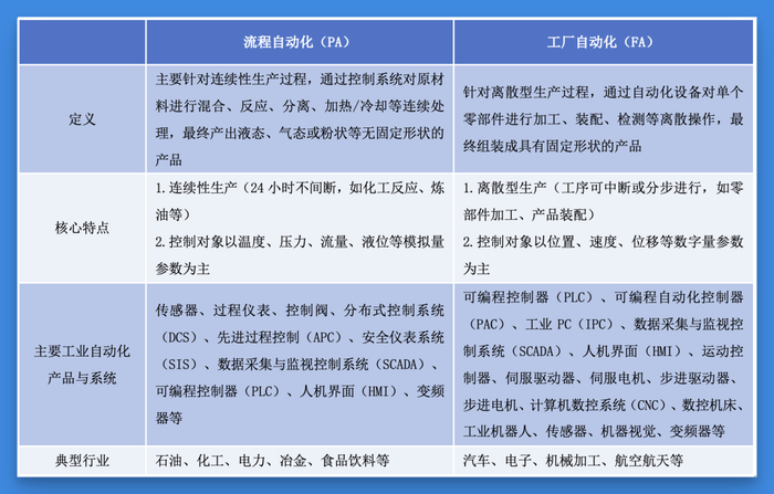 表1 流程自动化(PA)与工厂自动化(FA)对比