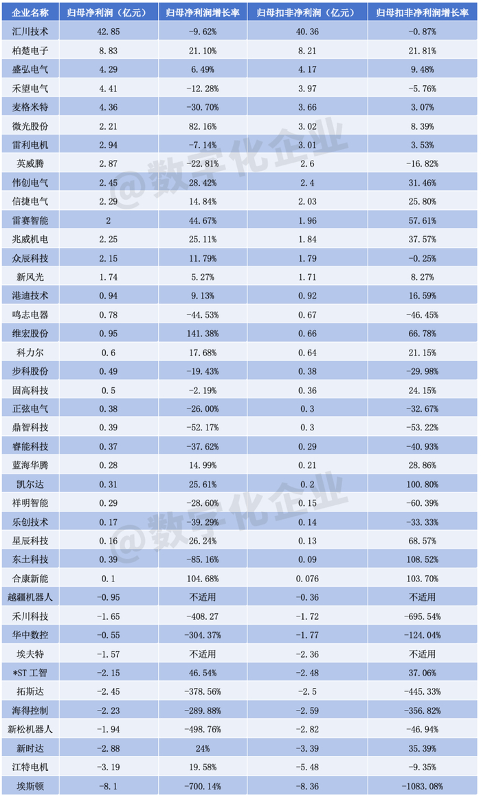 从归母扣非净利润来看,41家上市企业中(因美的集团和海康威视的工业自动化业务为非核心业务,未纳入统计),30家实现盈利,11家上市企业出现亏损,两极分化明显。例如,凯尔达、合康新能、东土科技的归母扣非净利润增速均超过100%;埃斯顿、禾川科技、拓斯达等扣非净利润严重下滑。其中,埃斯顿2024年归母扣非净利润为-8.36亿元,同比骤降1083.08%。