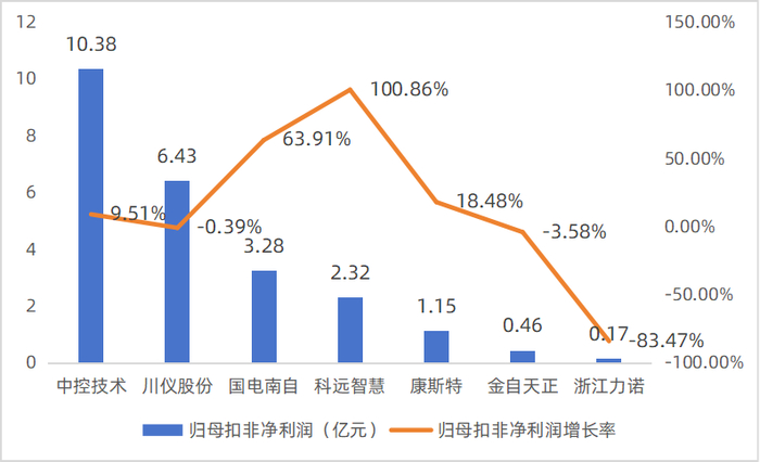 从归母扣非净利润来看,7家上市企业均实现盈利,但盈利能力表现不一。其中,中控技术、科远智慧、国电南自、康斯特的归母扣非净利润实现增长,川仪股份、浙江力诺和金自天正的归母扣非净利润出现下滑。