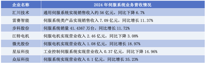 2024年,受光伏、锂电等多行业需求下滑以及市场竞争加剧等因素影响,部分上市企业的伺服系统业务收入出现下滑。例如,汇川技术通用伺服系统业务实现销售收入约56亿元,同比下降6.7%。江特电机伺服电机实现营业收入2.46亿元,同比下降3.08%。星辰科技的工业控制伺服系统版块实现营业收入0.37亿元,同比下降14.96%。但也有部分厂商的伺服系统业务实现增长。例如,雷赛智能的伺服系统类产品实现销售收入7.09亿元,同比增长11.37%。步科股份的伺服系统销量为41.4367万台,同比增长11.72%。