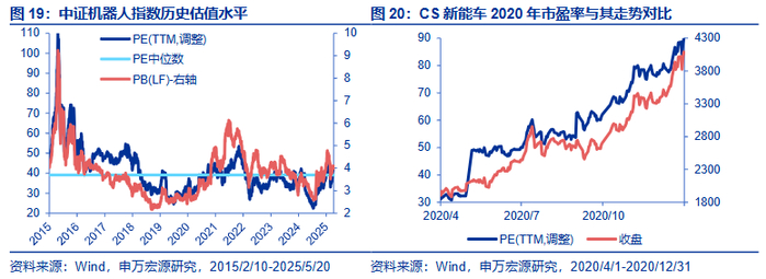 从估值水平来看,申万宏源表示,2015年2月 10 日以来,机器人ETF基金(159213)标的指数机器人指数市盈率、市净率的中值分别为39.1倍、3.72 倍。截止 2025 年5月 20 日,指数 PE、PB 分别为 42.0、3.99 倍,分别处于 60.7%、62.4%的分位数水平,略高于估值水平中枢。不过,机器人产业作为科技成长型行业,新能车板块 2020 年二季度的表现或可借鉴:CS新能车指数在20年5月初估值先行,20年5月末启动一波上涨行情,并延续至 2020年末。机器人指数当前估值水平安全,盈利增长确定性强,2025 年后续必将有所表现。