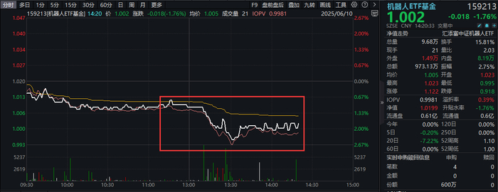 A股午后风云突变,机器人板块跌幅居前,截至6月10日14:20,机器人ETF基金(159213)持续回调,午后跌1.76%,溢价持续走阔,反映买盘实力强劲,盘中获资金净申购600万份,资金逢跌布局趋势明显!