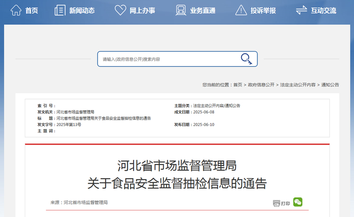 河北省市场监督管理局关于食品安全监督抽检信息的通告(2025年第13号)