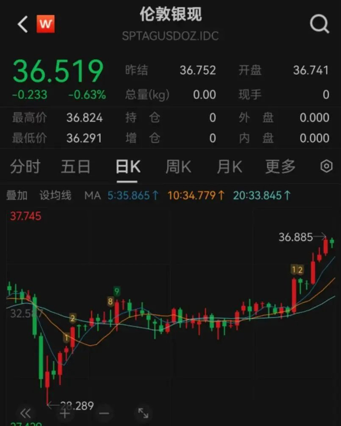 Wind数据显示,6月5日,伦敦现货白银价格盘中一度突破36美元/盎司关口,刷新2012年2月以来最高纪录。截至当地时间6月9日收盘,伦敦现货黄金上涨0.47%,3325.02美元/盎司;COMEX黄金期货基本持平,报3346.7美元/盎司;伦敦现货白银、COMEX白银期货价格均涨超2%,伦敦现货白银最高涨至36.885美元/盎司。