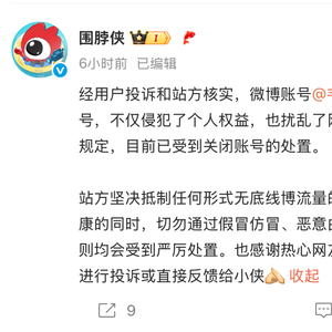 微博方面还表示,站方坚决抵制任何形式无底线博流量的行为,也提醒广大网友,就事论事关注个人健康的同时,切勿通过假冒仿冒、恶意曲解、编造阴谋论等方式借机博眼球蹭流量,否则均会受到严厉处置。如遇相关违规行为,请网友及时进行投诉或反馈。