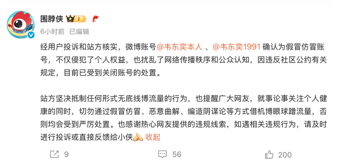 6月10日,微博社区观察员官方账号“围脖侠”发布微博称:经用户投诉和站方核实,微博账号@韦东奕本人 、@韦东奕1991 确认为假冒仿冒账号,不仅侵犯了个人权益,也扰乱了网络传播秩序和公众认知,因违反社区公约有关规定,目前已受到关闭账号的处置。
