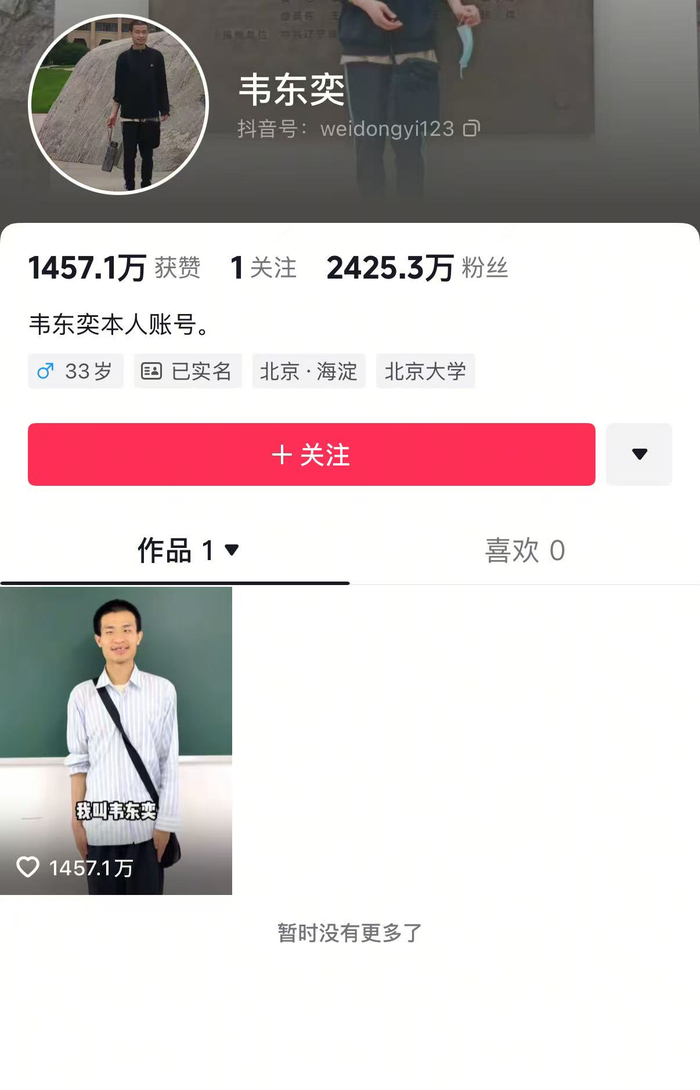 韦东奕日前在抖音平台开通个人社交账号并发布一段介绍自己的短视频,引发网民关注,短时间内迅速涨粉。截至发稿,韦东奕抖音账号粉丝量已突破2400万。