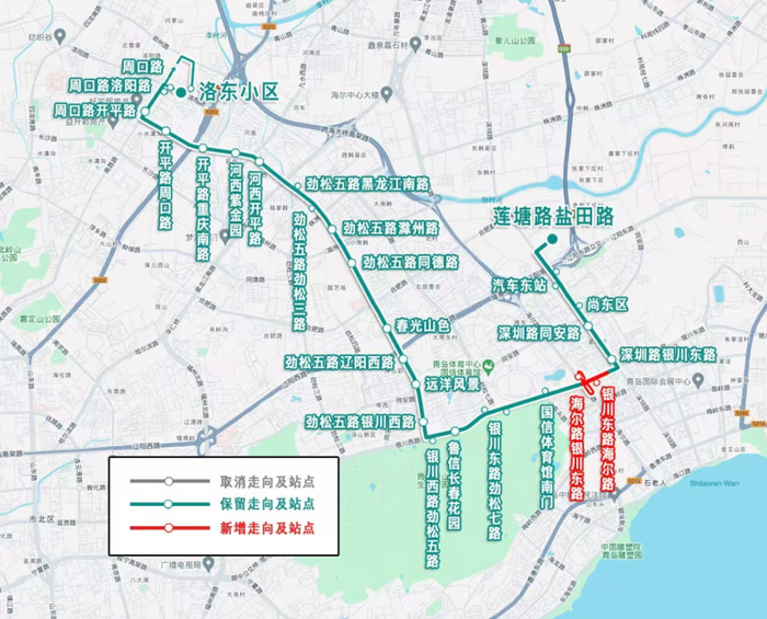 往洛东小区方向:原路线至“深圳路银川东路”站,沿银川东路、海尔路、金家岭立交、银川东路至“国信体育馆南门”站,恢复原路线。