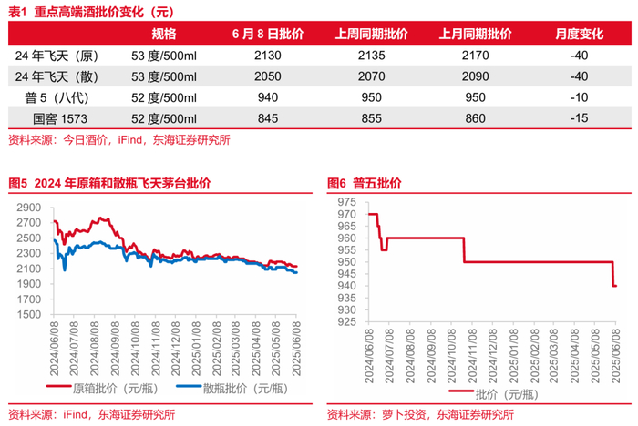 白酒:淡季板块持续筑底,关注头部酒企。白酒板块持续筑底,淡季动销平淡。消费场景减少,受政策影响市场情绪谨慎。今世缘:二季度价格保持相对稳定,库存处于可控水平。行业层面高端礼赠市场承压明显,公司将积极应对挑战,坚定稳价策略。今年以来线上增长超出既定目标,达到大两位数,增长幅度高于省内省外的均速。未来5-10年,公司仍致力于超级大单品四开的打造。迎驾贡酒:公司短期将巩固核心市场,中期通过差异化竞争与区域聚焦打开增量市场,长期则推进“文化迎驾战略”,提升品牌力;深化渠道精细化运营,深耕省内市场,突破省外潜力市场。批价更新:上周飞天茅台批价小幅下跌。截至6月8日,2024年茅台散飞批价2050元,周环比下降20元,月环比下降40元;2024年茅台原箱批价2130元,周环比下降5元、月环比下降40元。五粮液普五批价为940元,周、月环比下降10元。国窖1573批价845元,批价周环比下降10元,月环比下降15元。白酒板块估值处于底部区间,且基本面预期较低,风险充分释放。白酒行业竞争加剧,分化集中趋势不变,头部酒企在品牌壁垒和战略升级中不断扩大市场份额,建议关注高端酒和区域龙头。