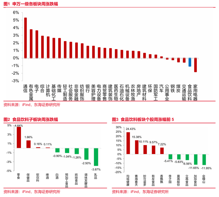 二级市场表现:上周食品饮料板块下跌1.06%,跑输沪深300指数1.94个百分点,食品饮料板块在31个申万一级板块中排名第30位。子板块方面,上周零食表现相对较好,上涨4.64%。个股方面,上周涨幅前五为均瑶健康、青海春天、妙可蓝多、有友食品、香飘飘,分别为24.43%、15.38%、10.11%、9.57%、7.22%,跌幅前五为李子园、莫高股份、立高食品、加加食品、会稽山,分别为-5.41%、-5.83%、-6.56%、-11.65%、-11.95%。