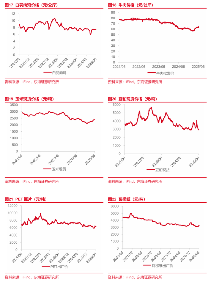 农产品价格:截至2025年6月6日,玉米2387.84元/吨,周环比+0.31%,同比-2.39%;豆粕2939.71元/吨,周环比-1.19%,同比-14.44%。