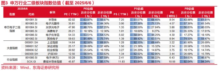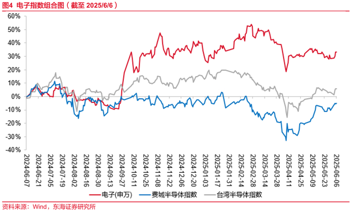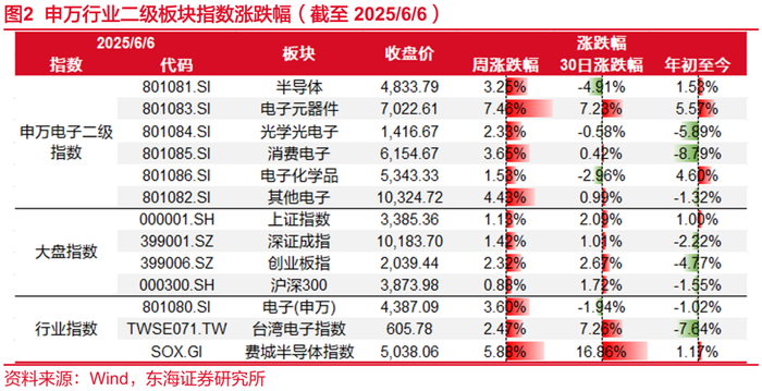 截止6月6日,申万电子二级子板块涨跌:半导体(+3.25%)、电子元器件(+7.46%)、光学光电子(+2.33%)、消费电子(+3.65%)、电子化学品(+1.53%)、其他电子(4.43%)。海外方面,台湾电子指数上涨2.47%,费城半导体指数上涨5.88%。