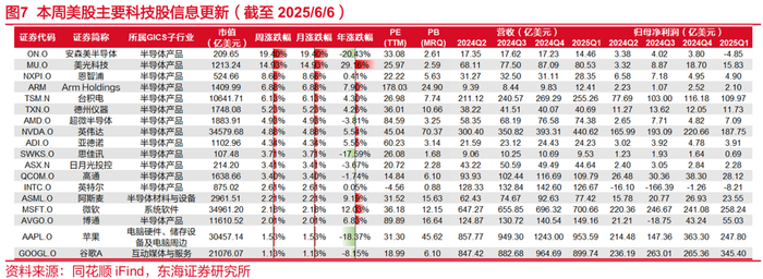 我们选取了较有代表性的部分美股科技股,并将相关信息更新如下。本周涨幅较大的为安森美半导体(19.40%)、美光科技(14.93%)和恩智浦(8.66%)。