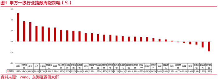 本周沪深300指数上涨0.88%,申万电子指数上涨3.60%,行业整体跑赢沪深300指数2.72个百分点,涨跌幅在申万一级行业中排第3位,PE(TTM)50.28倍。