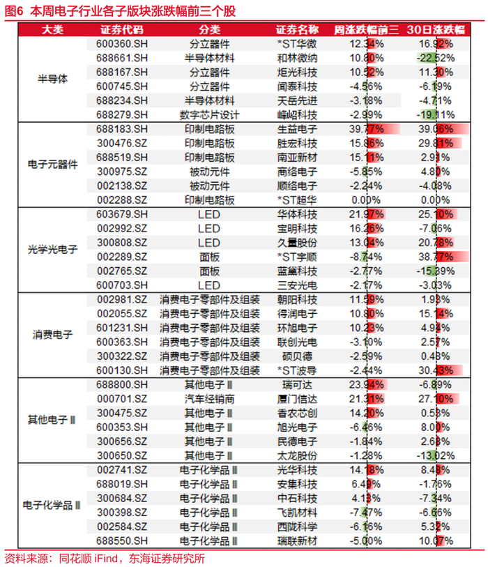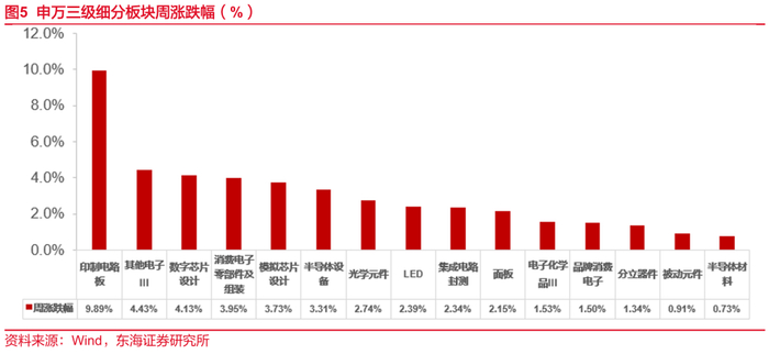 本周半导体细分板块涨跌幅分别为:品牌消费电子(+1.50%)、消费电子零部件及组装(+3.95%)、半导体设备(+3.31%)、面板(+2.15%)、被动元件(+0.91%)、LED(+2.39%)、数字芯片设计(+4.13%)、模拟芯片设计(+3.73%)、印制电路板(+9.89%)、电子化学品Ⅲ(+1.53%)、光学元件(+2.74%)、半导体材料(+0.73%)、其他电子Ⅲ(+4.43%)、集成电路封测(+2.34%)、分立器件(+1.34%)。