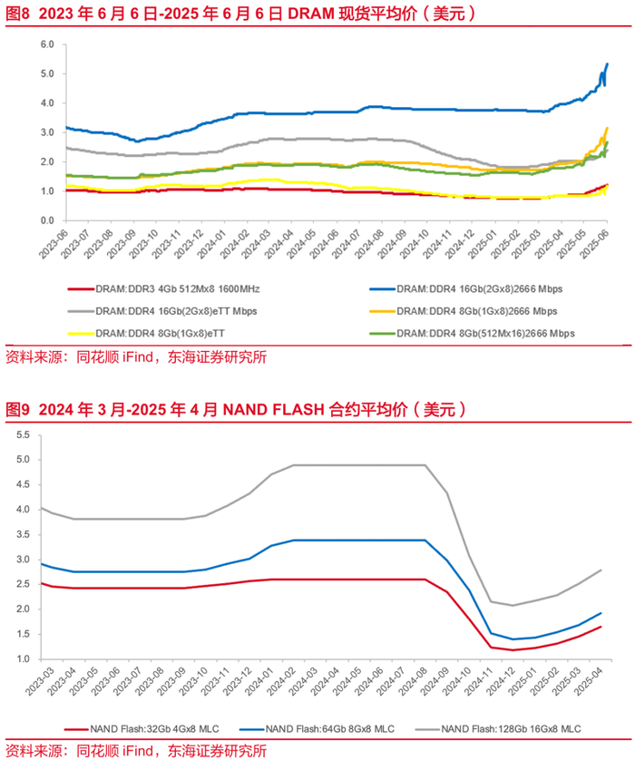 (1)存储芯片价格自2023年下半年以来小幅度反弹,但自2024年9月起,DRAM现货价格略有承压,部分 DRAM 细分产品价格自2025年2月中旬开始有所回升,6月初有小幅震荡。NAND Flash合约价格在大幅下滑后于2025年1月起有所回暖,4月仍延续上行走势。