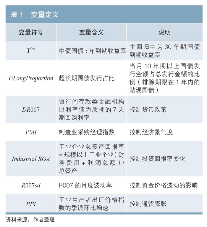 本文选取我国2015年至2024年的月度经济和金融数据6,数据来源为万得(Wind)数据库。变量选择方面,以30年期国债到期收益率为被解释变量,以超长期国债发行占比为解释变量。控制变量及具体定义见表1。日度变量的降频方法为取月度均值。
