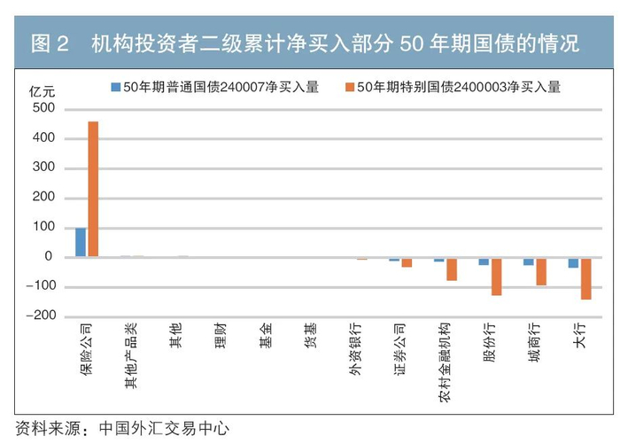 投资者结构方面,50年期国债的持有者多为保险机构,以配置为主3。本文选择最近发行的50年期国债(代码分别为240007和2400003)进行展示。如图2所示,保险机构在二级市场持有50年期普通国债240007及50年期特别国债2400003的规模分别为100亿元、460亿元,占个券二级流通量4比重分别为90%、97%,显示50年期特别国债和普通国债的投资者结构相似。