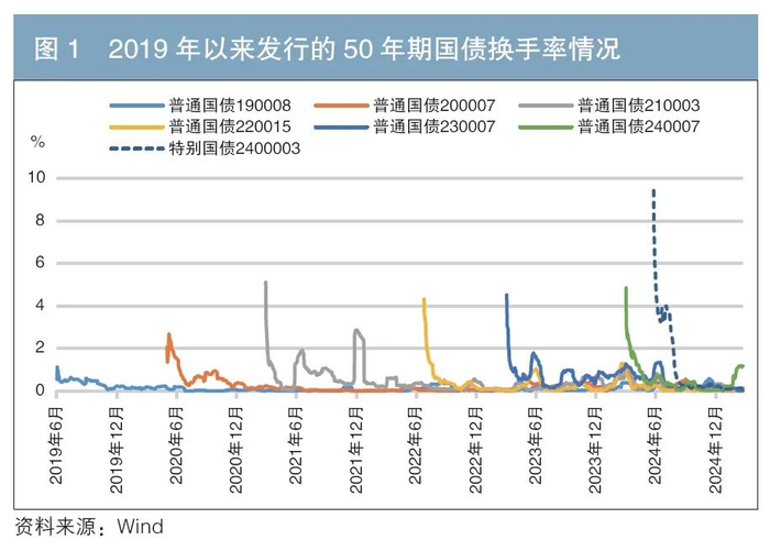 本文重点关注超长期特别国债与普通国债在流动性、投资者结构及定价机制方面的差异。研究主要聚焦在50年及30年期国债。因为现存国债中,期限为15年的仅有1只特别国债(代码为2400102);20年期普通国债的最近一次发行是在2015年,与2024年新发行的特别国债在剩余期限上存在较大差距,可比性较差。