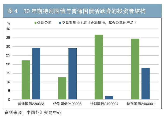 高莉莎等(2023)发现,2020年以来,30年期国债的活跃度快速提升及新券相对老券的流动性溢价,源于农村金融机构、基金等交易型金融机构的积极参与。但是,在2024年5—9月,交易型金融机构参与度下降(见图3),此间上市的30年期特别国债2400001和2400004多被保险等配置型机构所承接。10月之后,市场情绪好转,交易型机构再度活跃,新上市的30年期特别国债2400006的市场需求也有明显回升。数据表明,30年期特别国债2400006的交易型机构持有份额占比持平于30年期普通国债230023,明显高于30年期特别国债2400001和2400004(见图4),所以30年期特别国债2400006的流动性好于30年期普通国债230023,再度符合新券流动性更好的特征。综上,30年期特别国债2400001和2400004较30年期普通国债230023流动性弱,应该是特定时期交易型机构参与度降低所致,并非特别国债和普通国债的固有差异。